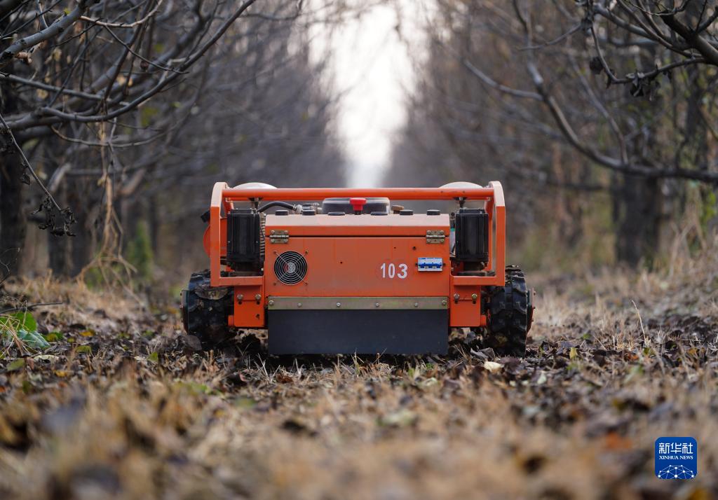 一台無人割草機器人在威縣賀營鎮紅龍集村的梨園裏除草(11月21日攝)。