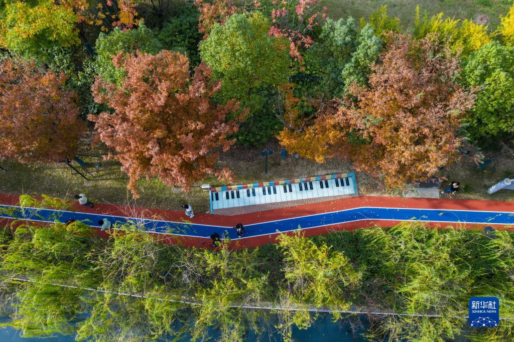 11月22日,居民在龍泉街道祥和社區新建成的環河健康步道休閒散步(無人機照片)。