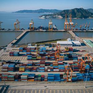 11月22日,裝載集裝箱的卡車行駛在溫州港狀元岙集裝箱碼頭內。