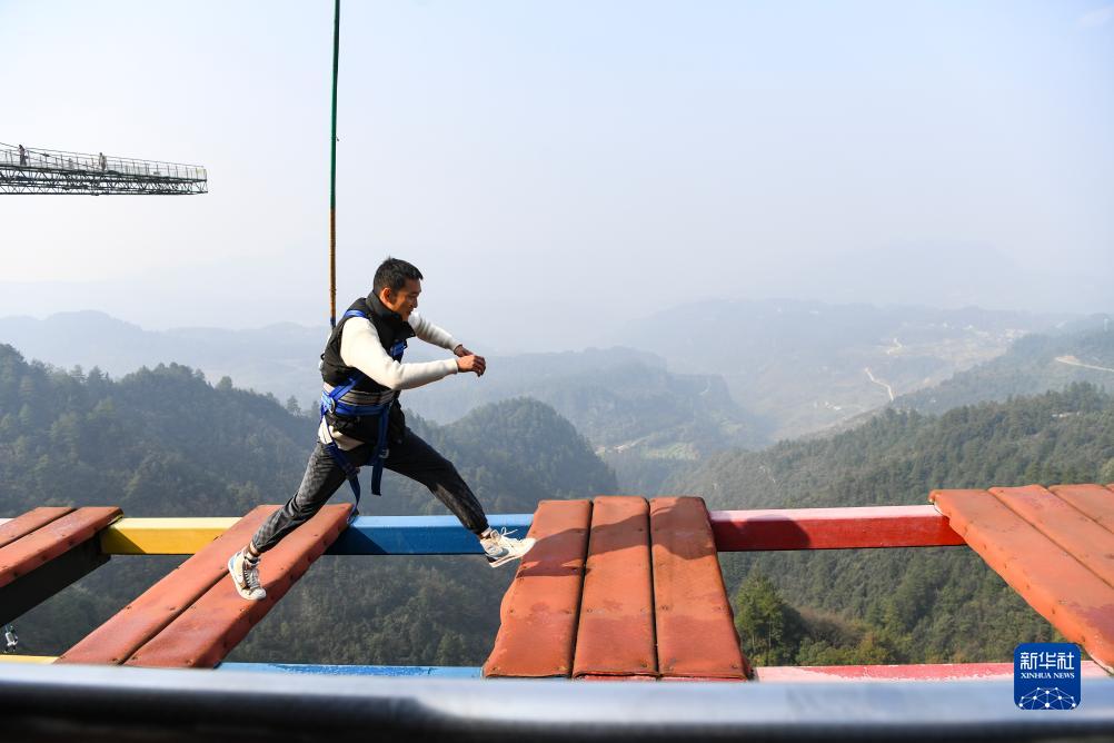 11月21日,游客在重慶市萬盛經開區奧陶紀景區體驗“極限飛躍”游玩項目。