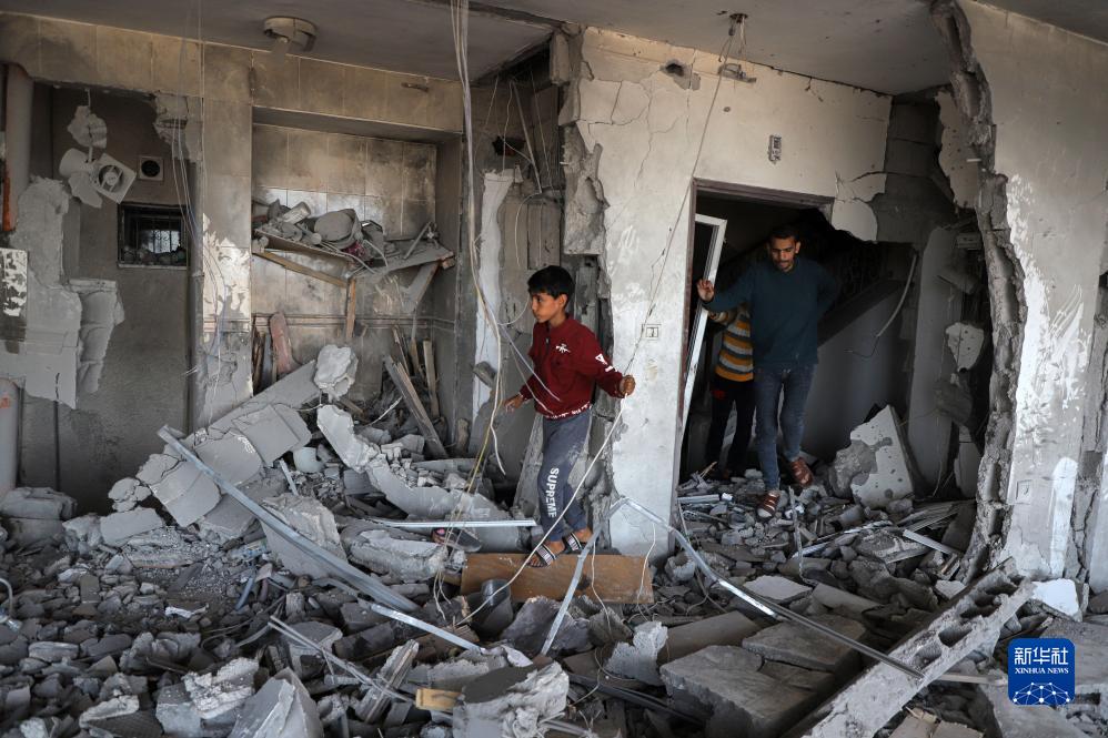 11月22日,在加沙地帶南部城市汗尤尼斯,巴勒斯坦人查看遭以色列襲擊後的建築廢墟。