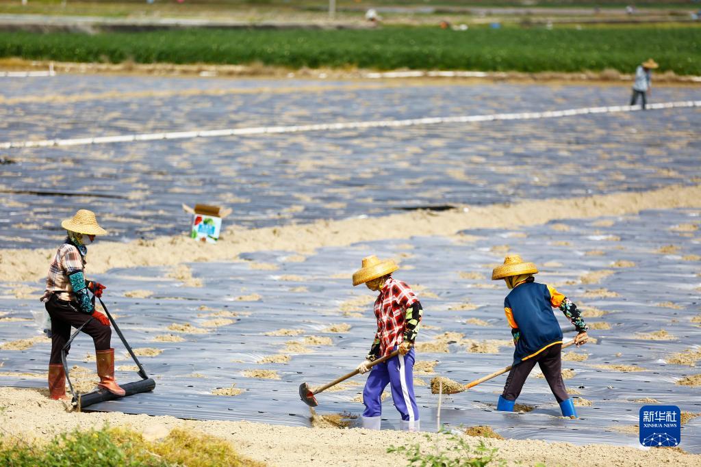 11月22日,海南省三亞市天涯區檳榔村村民在田間鋪地膜,準備種植冬季瓜菜。