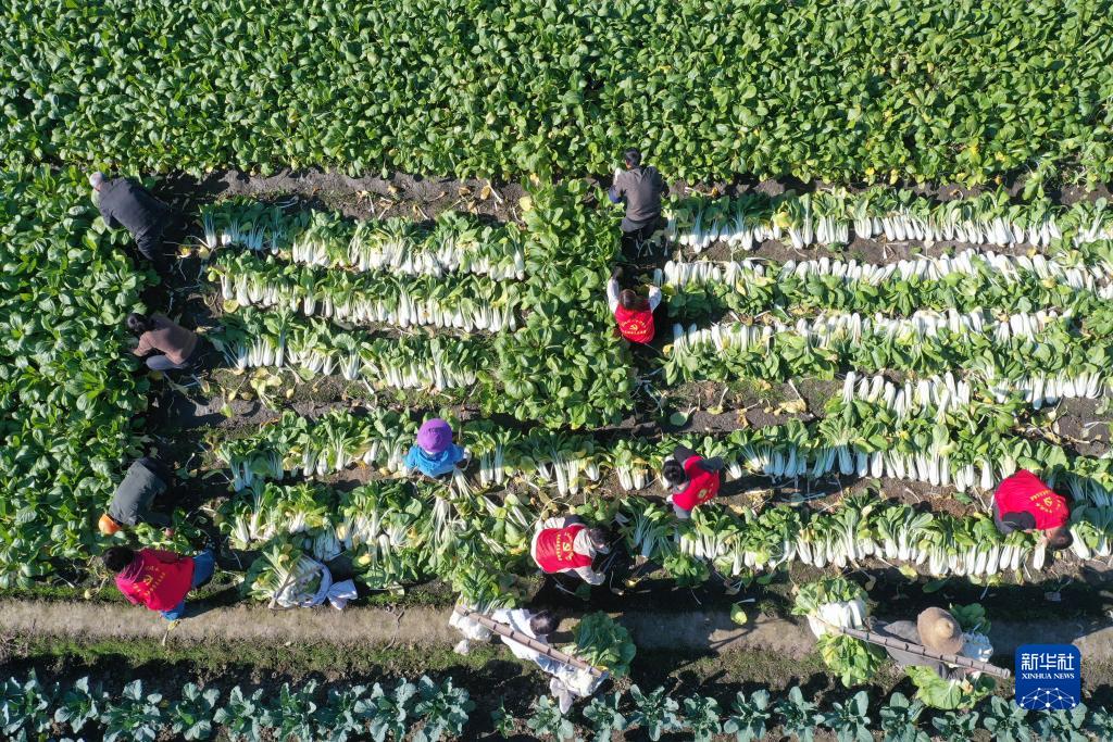 11月22日,在浙江省湖州市德清縣乾元鎮金火村,志願者幫助村民收割蔬菜(無人機照片)。