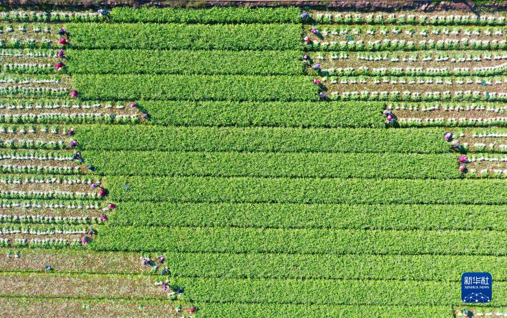 11月22日,在浙江省溫嶺市石橋頭鎮蔬菜基地,農民在采收高腳白菜(無人機照片)。