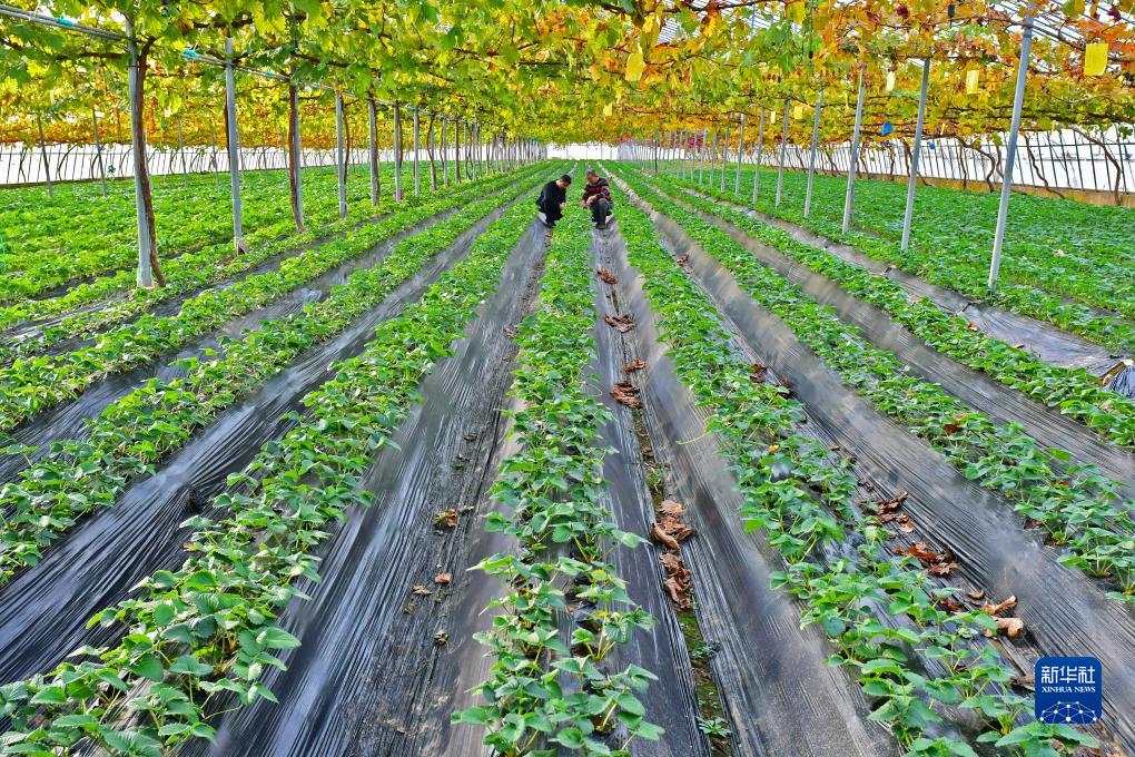 11月22日,農民在山東省煙&市福山區門樓街道肖家村碧樹農園管護草莓。