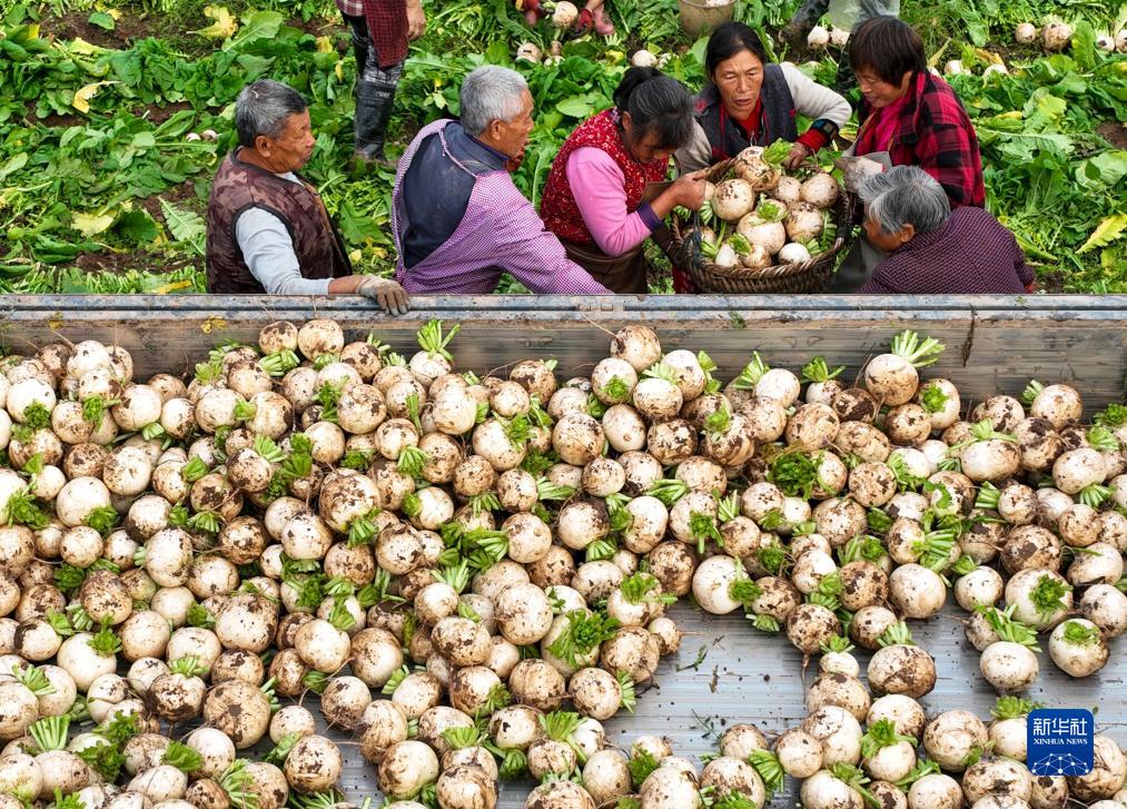 11月22日,四川省南充市蓬安縣平頭鄉三元貫村村民在采收白蘿蔔(無人機照片)。