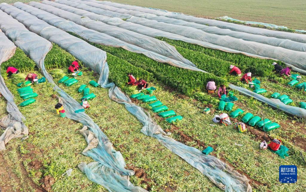 11月22日,在河北省邢&市南和區東三召鄉南頭村,菜農們在收穫芹菜(無人機照片)。