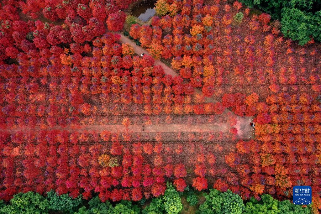 11月21日,游客在四川省眉山市東坡區太和鎮元寶村億嘉林木基地游玩(無人機照片)。