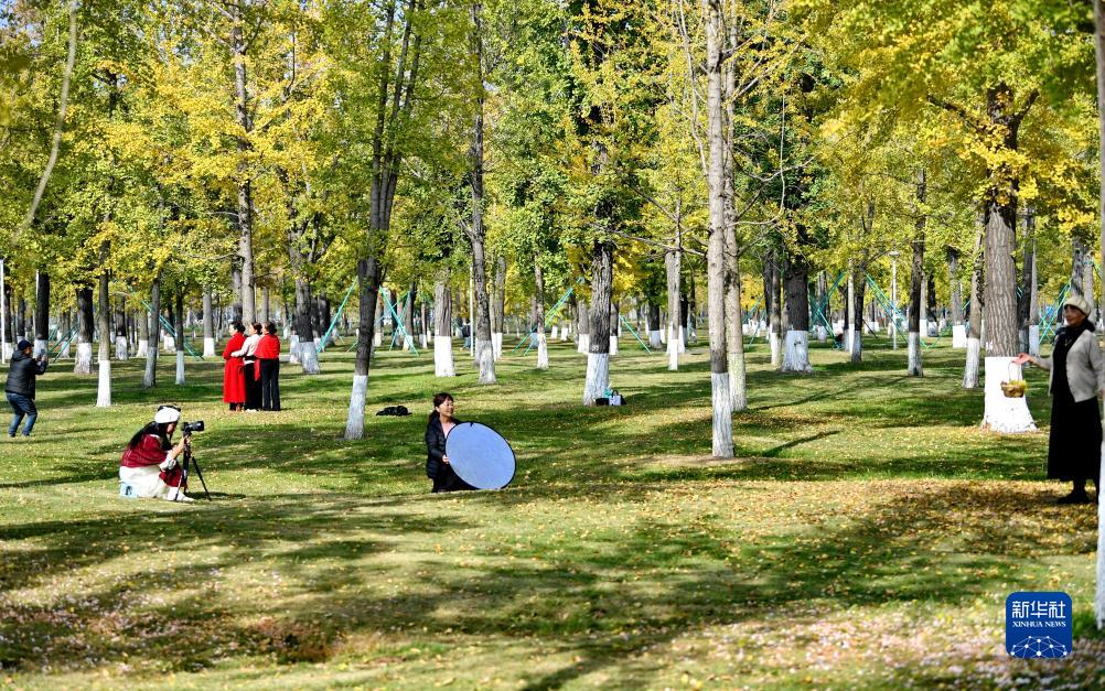 11月22日,游人在位於四川省成都市的電子科技大學清水河校區的銀杏林中拍照留念。