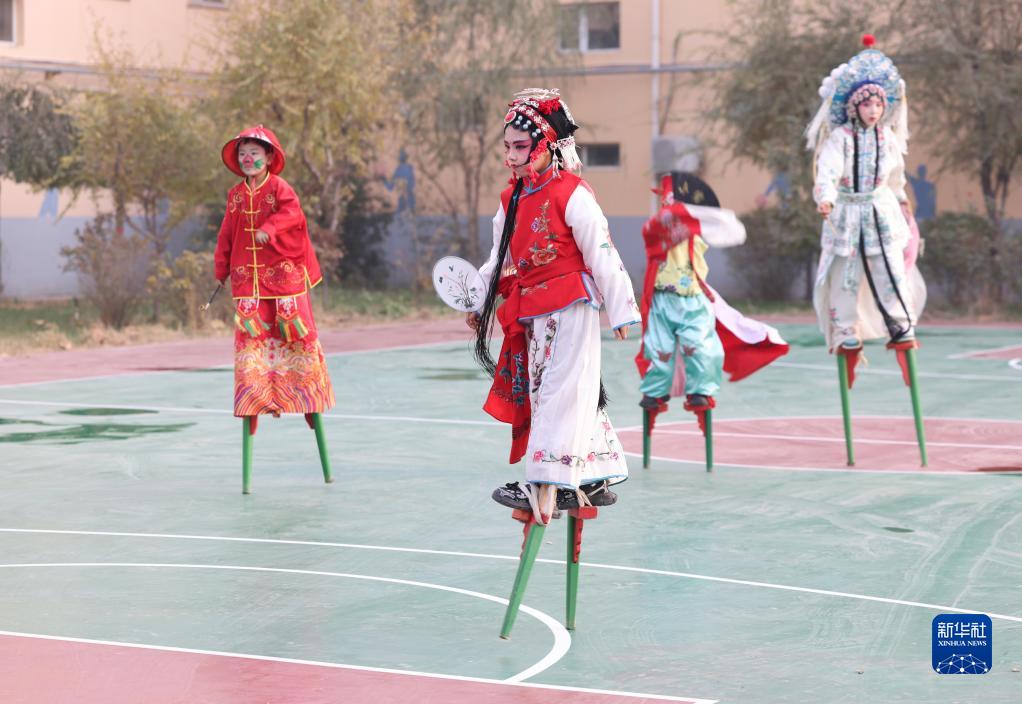 11月22日,河北省霸州市勝芳鎮紅光小學的學生在排練高蹺。