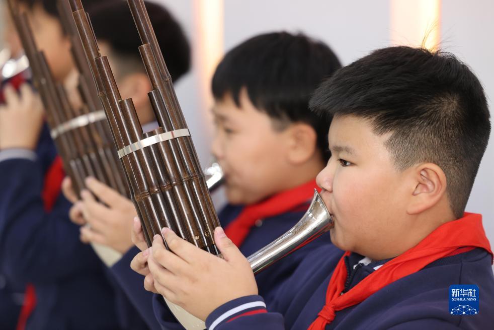 11月22日,河北省霸州市勝芳鎮紅光小學的學生在排練笙管樂。