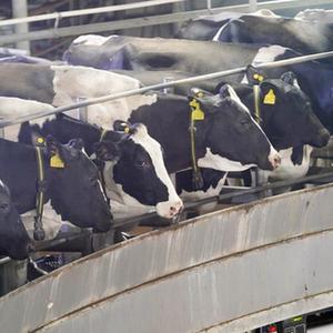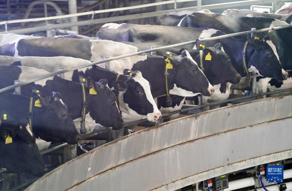 在威縣君樂寶乳業有限公司擠奶大廳,奶牛在轉盤式擠奶機上擠奶(11月22日攝)。
