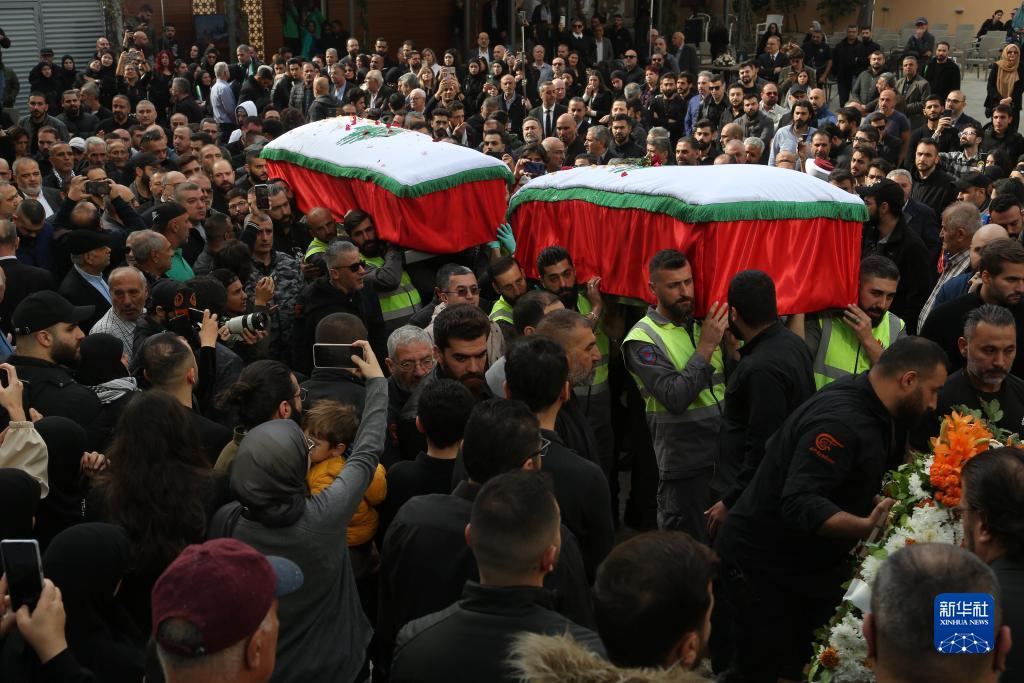 11月22日,在黎巴嫩貝魯特,人們為兩名在以軍襲擊中喪生的記者舉行葬禮。