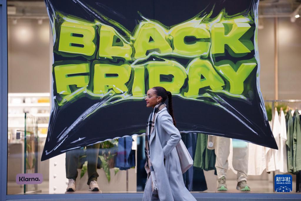 11月22日,在英國曼徹斯特,一名女子走過“黑色星期五”促銷廣告。