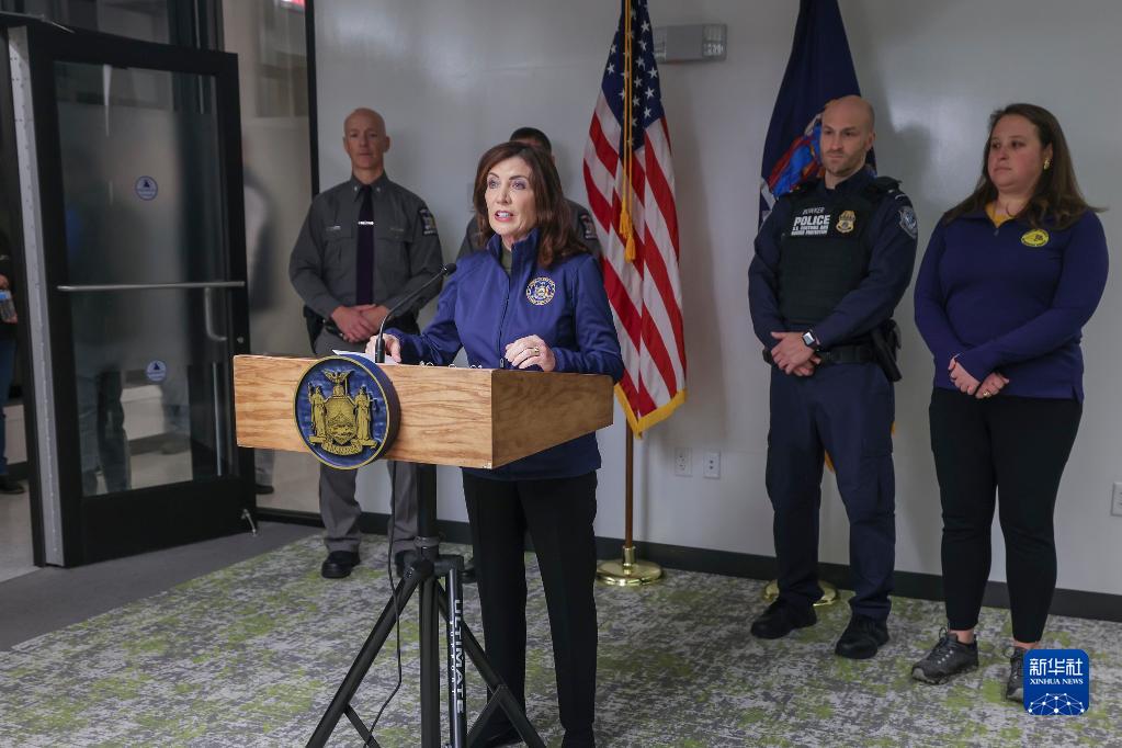 11月22日,美國紐約州州長霍楚爾(前)在紐約州尼亞加拉地區召開記者會。