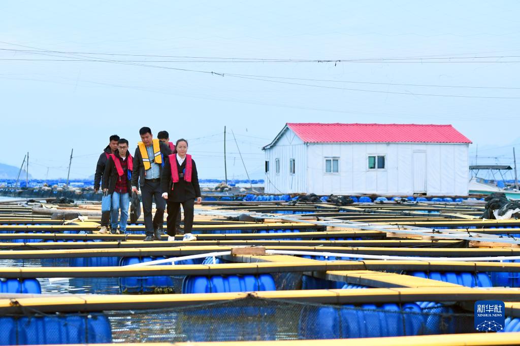 11月14日,福建省寧德市霞浦縣溪南鎮七星海上社區黨支部書記吳德枝(中)帶領工作人員在轄區漁排走訪。