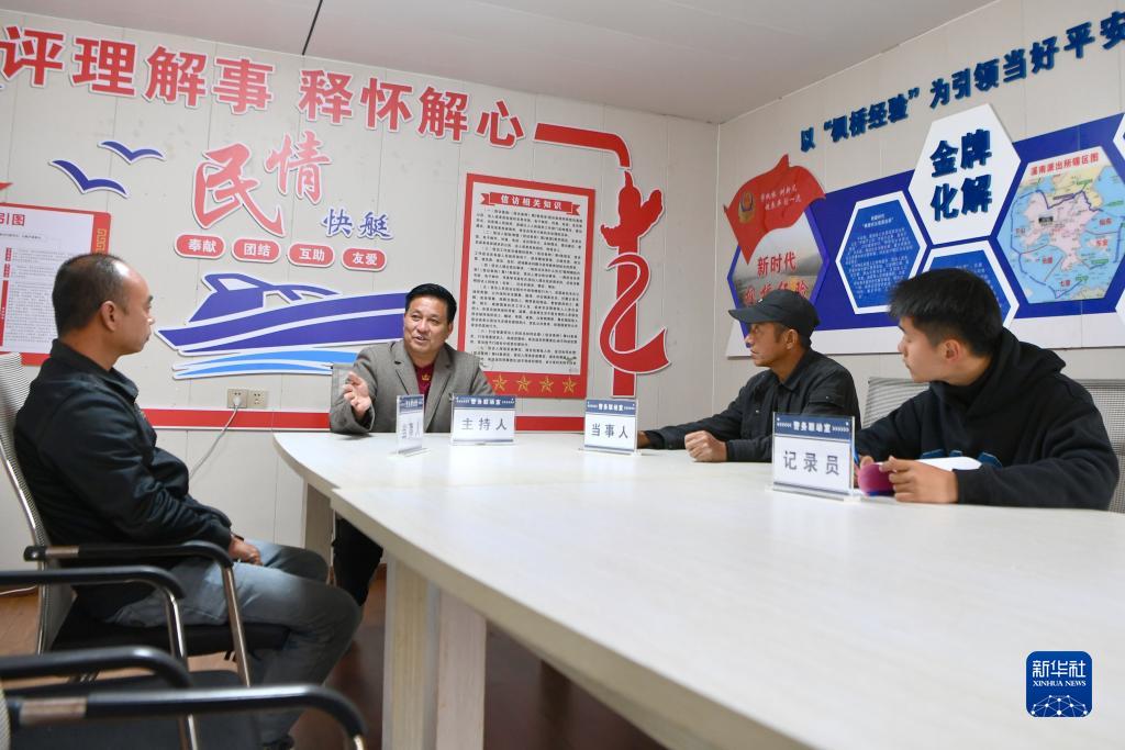 11月14日,福建省寧德市霞浦縣溪南鎮七星海上社區調解員謝友忠(左二)在調解一起海上養殖僱主與員工的工資糾紛。
