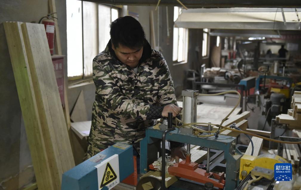 11月22日,工人在滑縣半坡店古典傢具特色小鎮內一家企業的生産車間內加工木料。