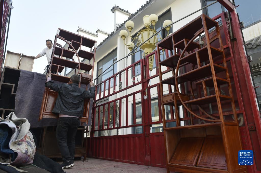 11月22日,在滑縣半坡店古典傢具特色小鎮,商戶在搬運傢具準備裝車外銷。
