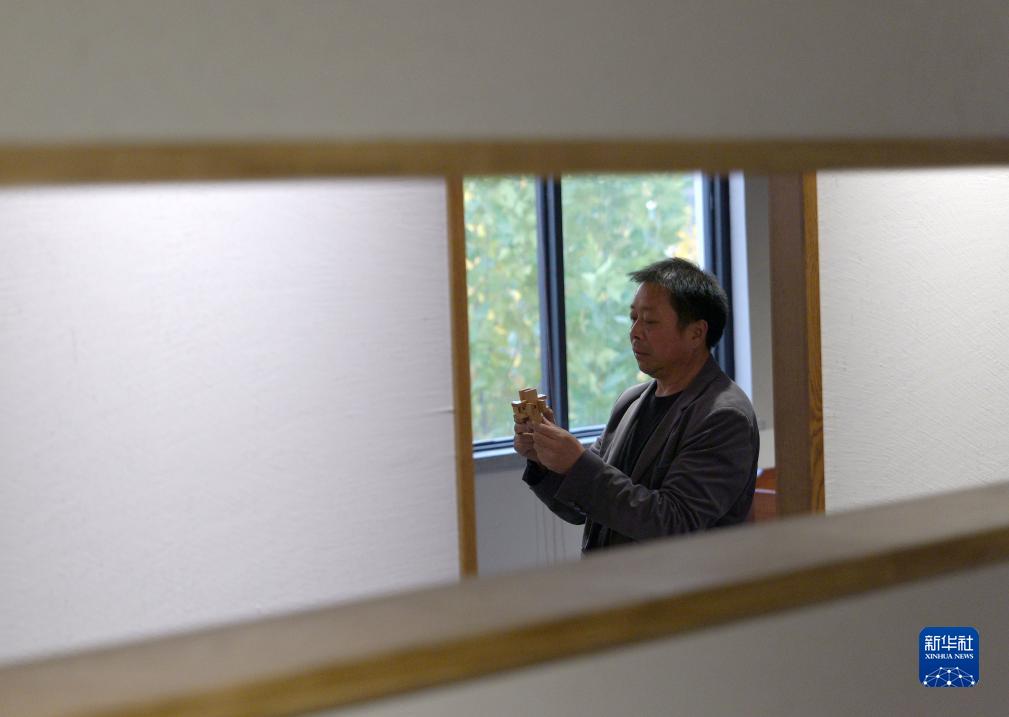 11月22日,在滑縣半坡店古典傢具特色小鎮,傢具匠人嚴書寶在研究榫卯結構。