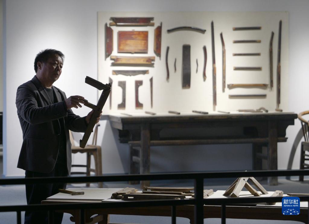 11月22日,在滑縣半坡店古典傢具特色小鎮,傢具匠人嚴書寶在查看傢具構件。