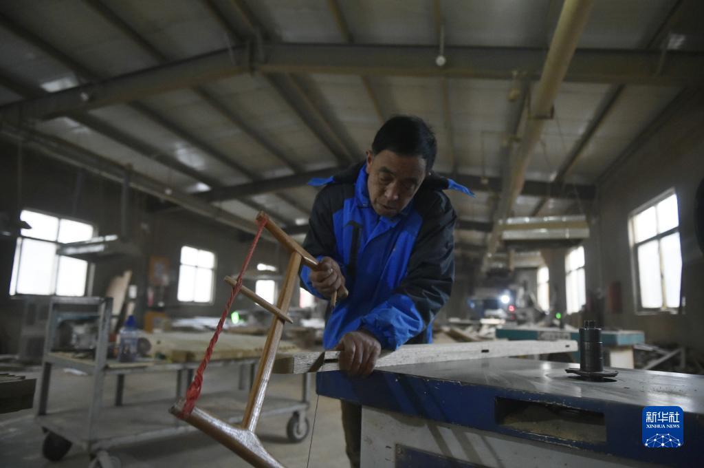 11月22日,工人在滑縣半坡店古典傢具特色小鎮內一家企業的生産車間製作傢具。