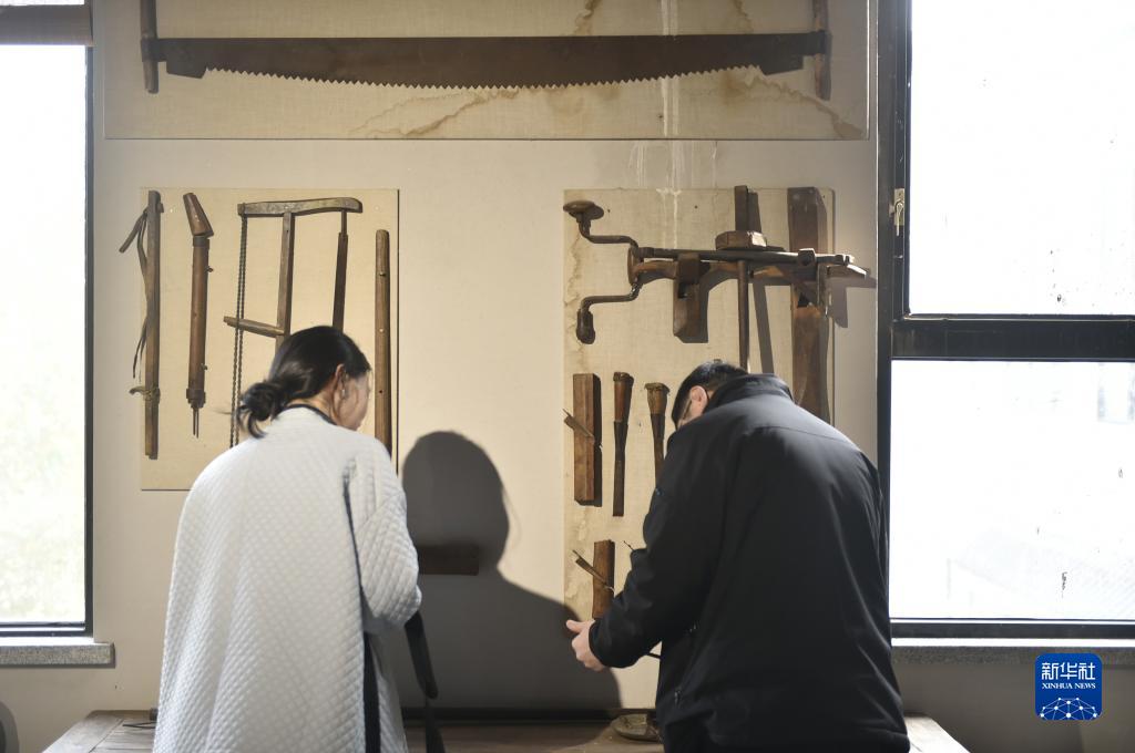 11月22日,來訪者在滑縣半坡店古典傢具特色小鎮的傢具博物館參觀。