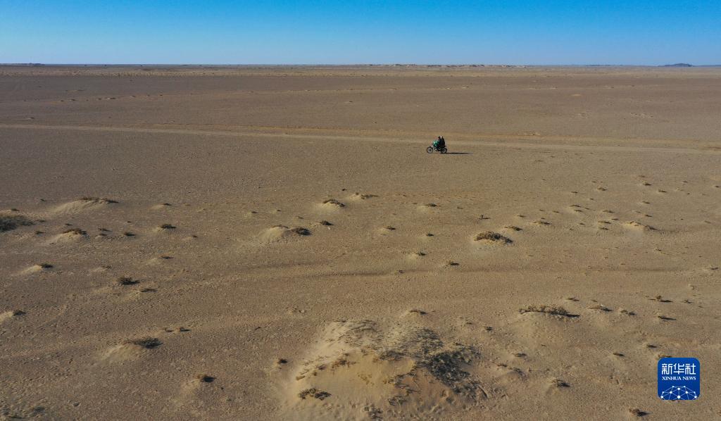 在內蒙古阿拉善左旗烏力吉蘇木溫都爾毛道嘎查,牧民朝勒門格爾勒和兒子溫都蘇在巡護邊境區域(11月17日攝,無人機照片)。