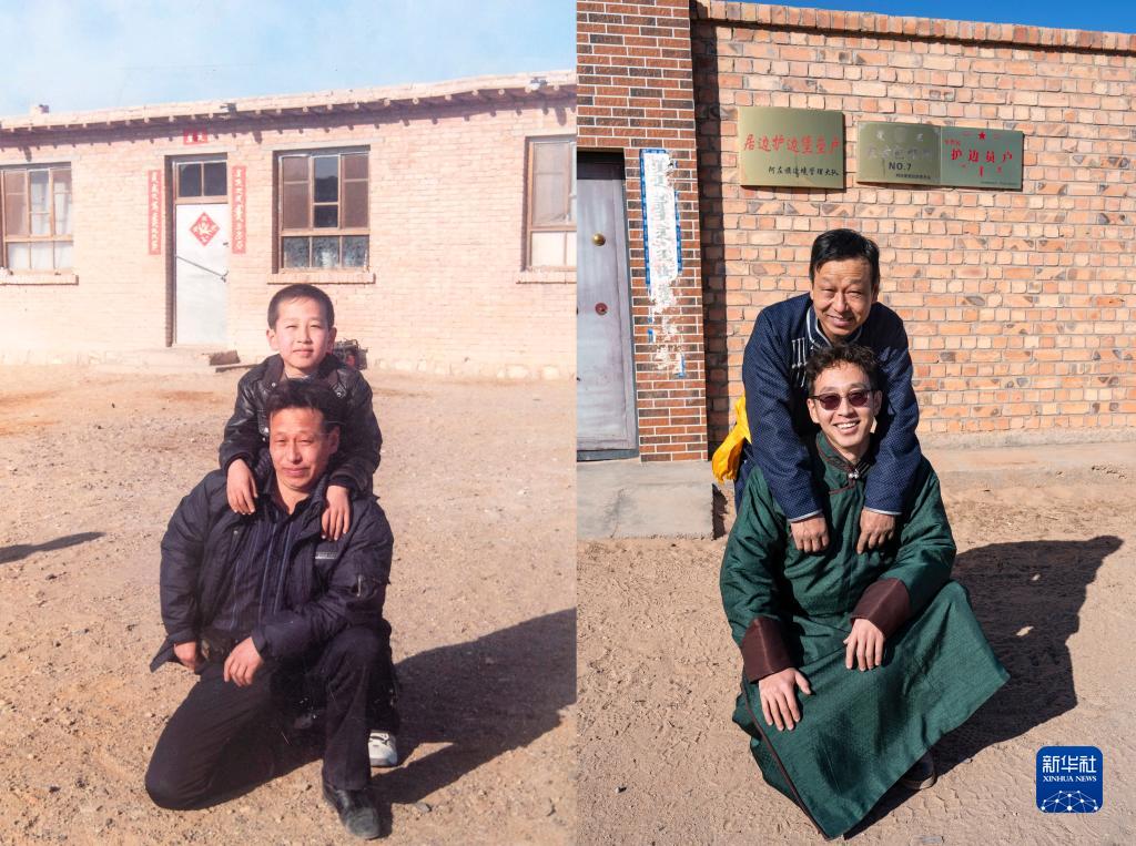 拼版照片:左圖為2006年牧民朝勒門格爾勒和7歲的兒子溫都蘇在家門口合影;右圖為2023年11月17日,24歲的溫都蘇(下)和父親合影留念。