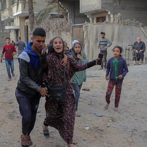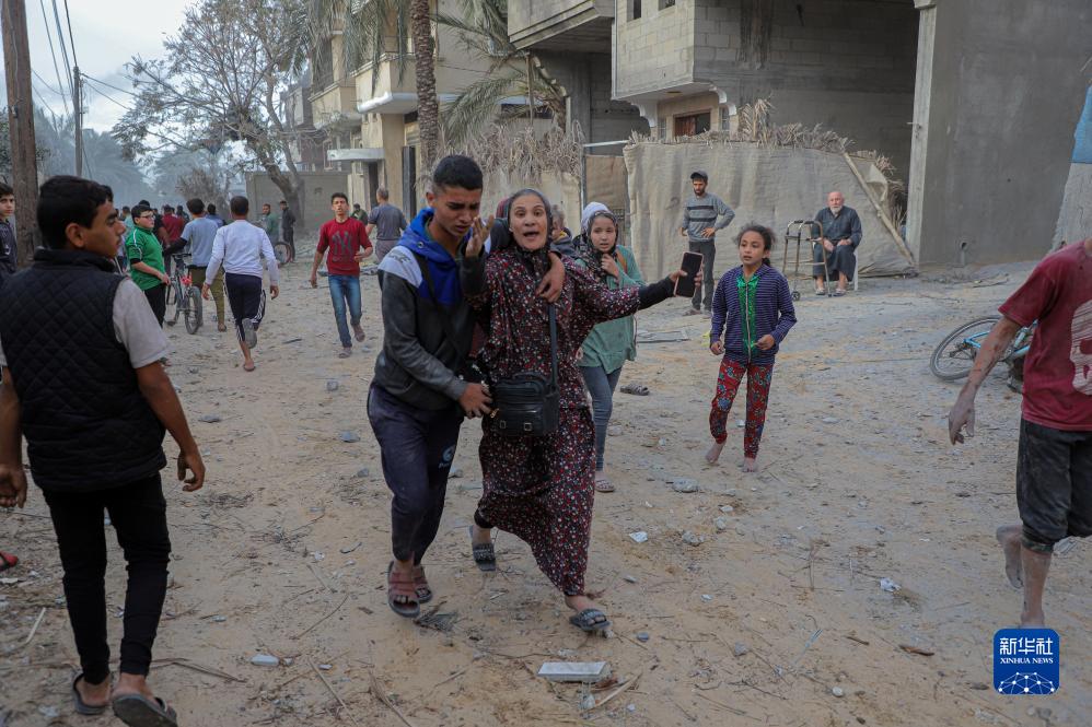 11月22日,在加沙地帶南部城市汗尤尼斯,人們救援以軍空襲後的傷者。