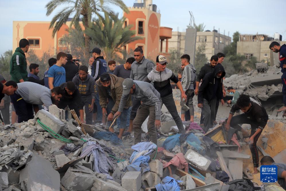 11月22日,在加沙地帶南部城市汗尤尼斯,巴勒斯坦人查看以軍空襲後的廢墟。