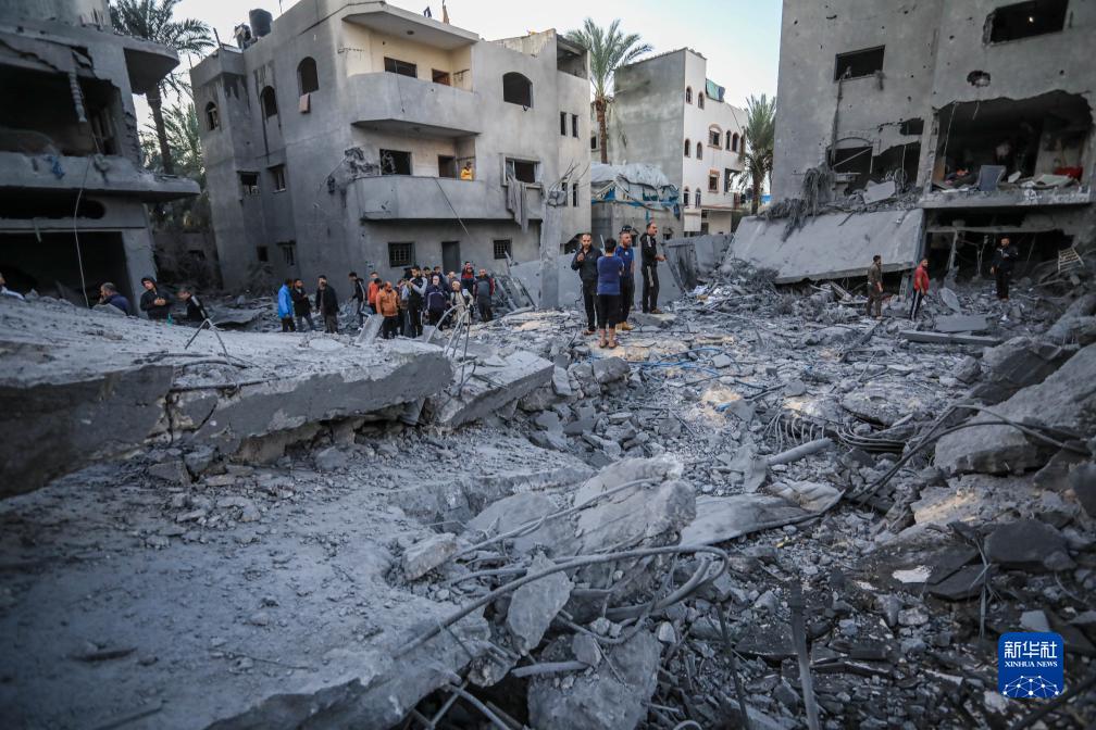 11月23日,在加沙地帶中部的代爾拜拉赫,巴勒斯坦人查看以軍空襲後的建築廢墟。