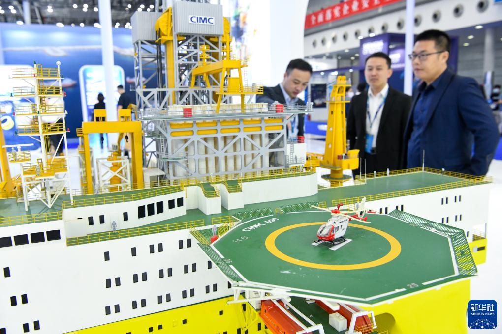 11月23日,觀眾在現場觀看中集集團展出的藍鯨1號鑽井平台模型。