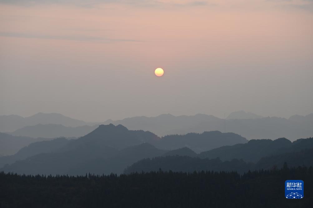 當日清晨,廣西樂業縣紅日初升,晨霧中的群山充滿詩情畫意。