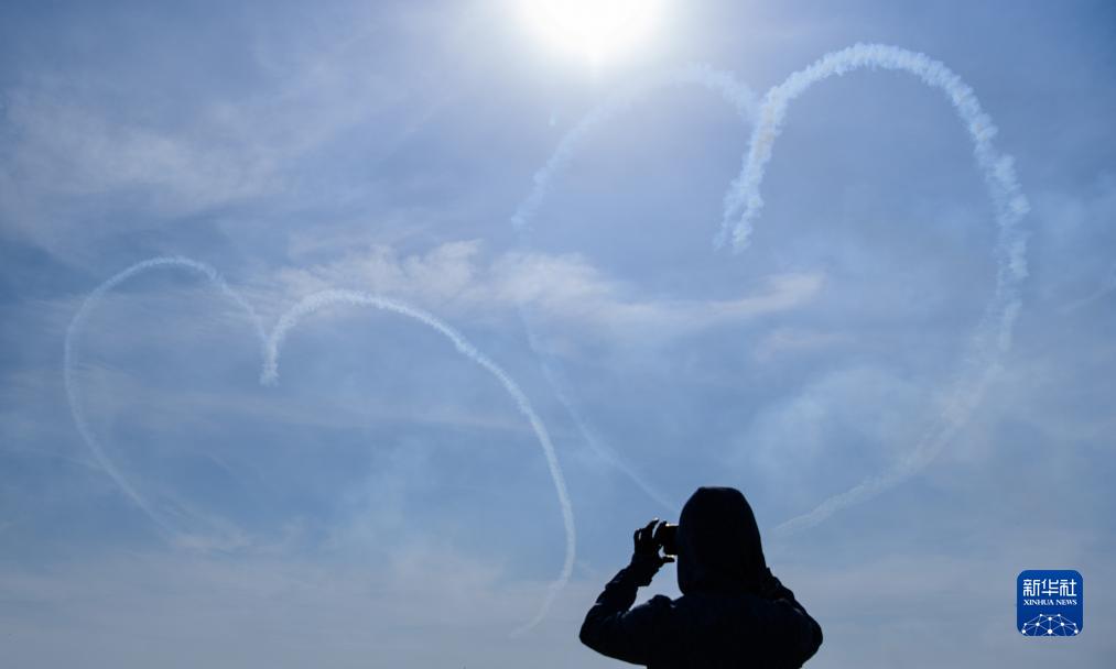 11月23日,歐洲“穿越騎士”飛行表演隊在2023亞洲通用航空展開幕式上進行飛行表演時,在天空中畫出巨大的心型圖案。