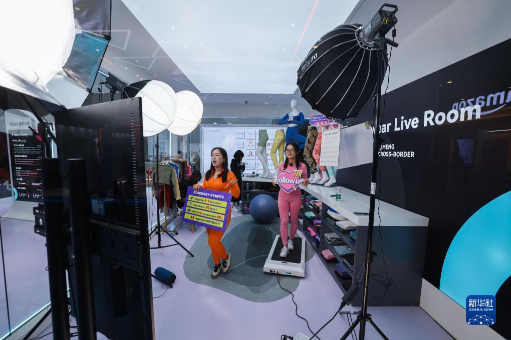 11月23日,在第二屆全球數字貿易博覽會的絲路電商館,跨境電商進行直播銷售。