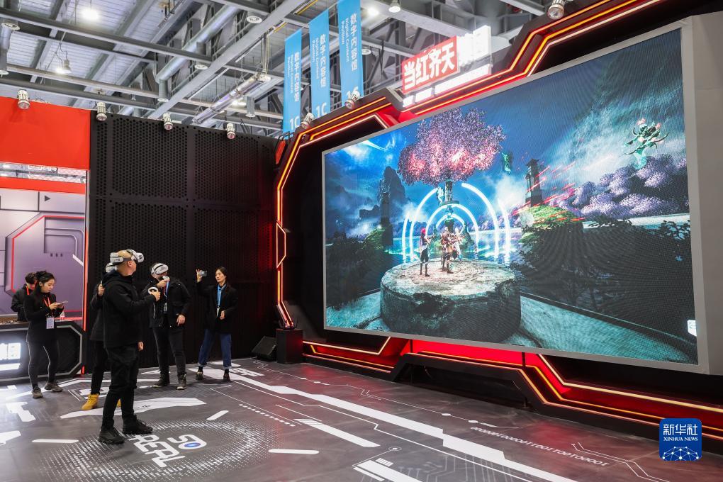 11月23日,觀眾在第二屆全球數字貿易博覽會數字內容館體驗應用虛擬現實技術的游戲。