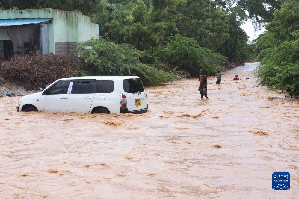 11月22日,在肯尼亞加裏薩,車輛涉水前進。