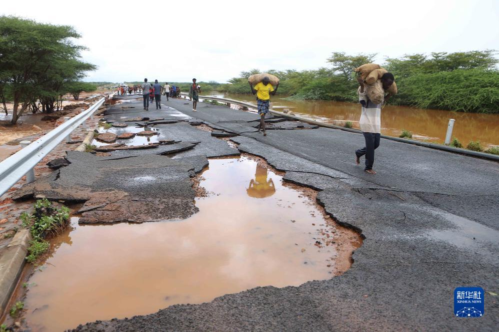 11月22日,人們走過被洪水沖毀的肯尼亞北部一條道路。