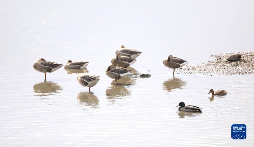近日,在遼寧省瀋陽市渾河上,一群群鴻雁、赤麻鴨、鴛鴦等候鳥遷徙來此棲息。它們成群結隊在河面上覓食、休憩,成為冬日裏一道美麗的風景線。