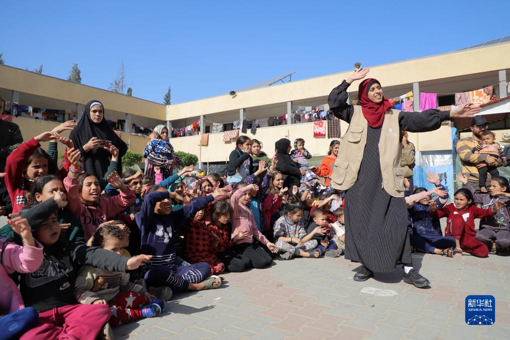 11月23日,在加沙地帶南部城市汗尤尼斯,當地誌願者和兒童進行互動。