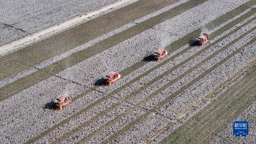 新疆庫爾勒市普惠農場一處棉田,農民駕駛大型採棉機採摘棉花(10月12日攝,無人機照片)。