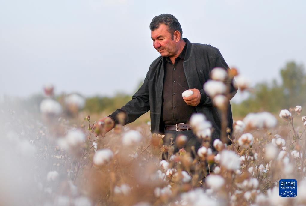 新疆尉犁縣巴西買裏村,棉農爾肯·熱衣木在自家棉田中查看棉花(10月20日攝)。