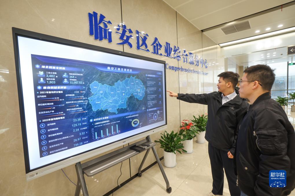 11月24日,臨安區企業綜合服務中心,兩位企業主在電子屏幕前了解臨安企業分佈及發展情況。
