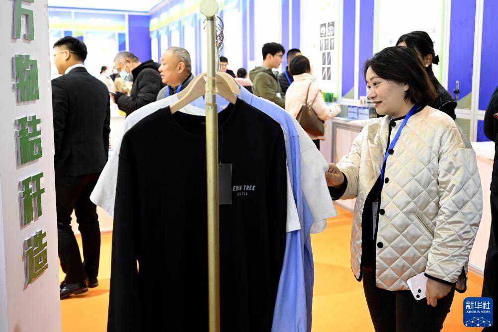 11月24日,在第三屆國際新材料産業大會展覽上,觀眾在參觀由秸稈加工製作成的衣服。