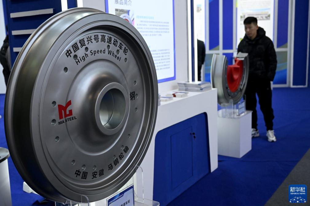 這是11月24日在第三屆國際新材料産業大會展覽上拍攝的中國復興號高速動車輪模型。