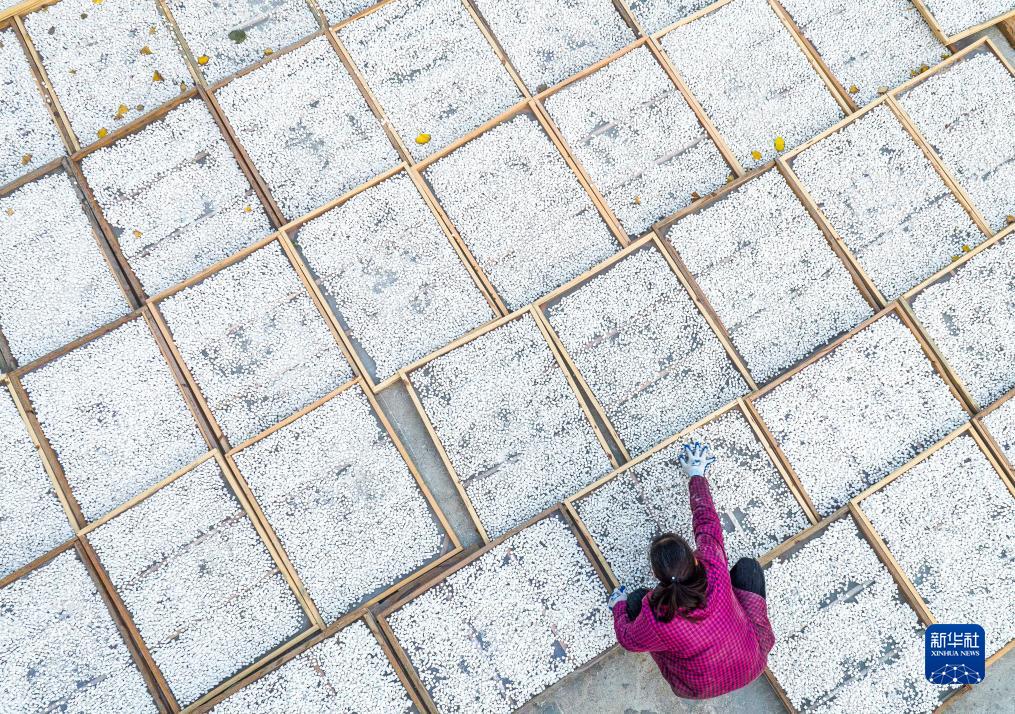 11月23日,在湖北省羅田縣九資河鎮天堂湖村,藥農在晾曬茯苓(無人機照片)。