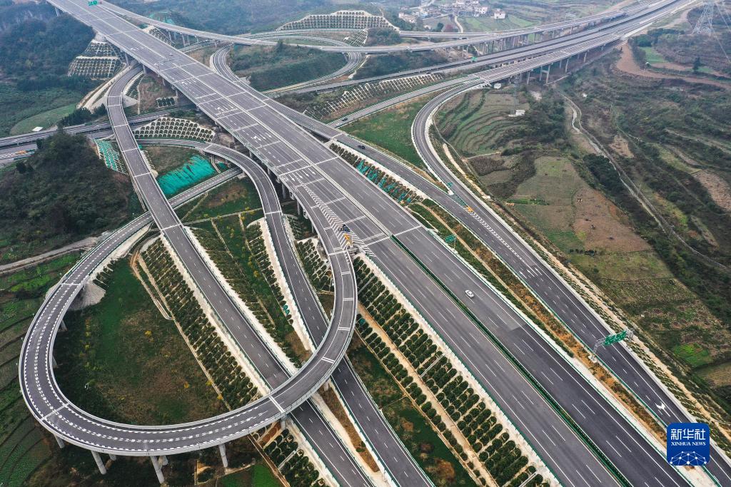 11月24日,車輛在貴金高速公路郝官樞紐上行駛(無人機照片)。