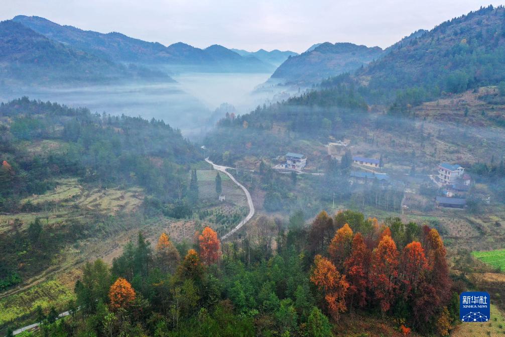 11月23日,在湖南省湘西土家族苗族自治州龍山縣水田壩鎮雙聯村晨霧繚繞(無人機照片)。