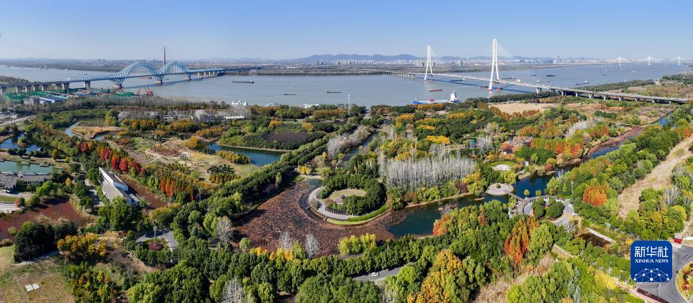 11月24日拍攝的位於江蘇省南京市雨花&區的三橋濕地公園(無人機全景照片)。